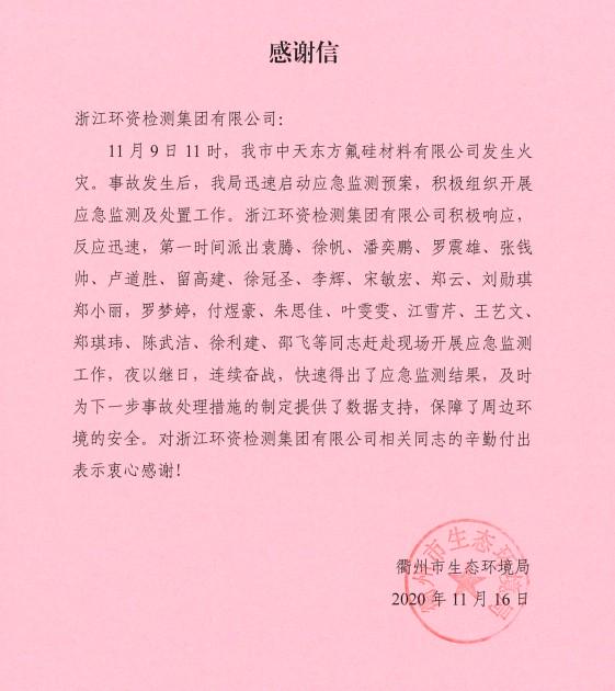近日,浙江環(huán)資檢測集團有限公司收到來自衢州市生態(tài)環(huán)境局的《感謝信》,感謝環(huán)資檢測集團在11月9日本市中天東方氟硅材料有限公司發(fā)生火災(zāi)衢州市生態(tài)環(huán)境局啟動的應(yīng)急預(yù)案中,積極響應(yīng),快速反應(yīng),抽派23名精干人員夜以繼日,連續(xù)奮戰(zhàn)3天3夜,快速提供應(yīng)急監(jiān)測結(jié)果,及時為事故處理措施提供數(shù)據(jù)支持,保障周邊環(huán)境安全。對環(huán)資檢測集團相關(guān)人員辛勤的付出表示衷心感謝!